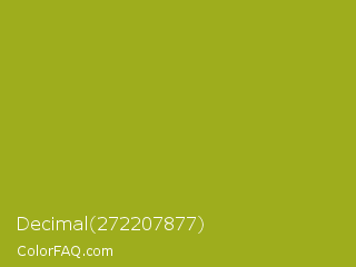 Decimal 272207877 Color is a normal yellow color and the nearest color is Citron #9fa91f. Hex code #9ead1d and RGB value is rgb(158,173,29). In RGB color space, this color is composed of 62% red, 68% green, 11% blue, In CMYK color space, this color is composed of 9% cyan, 0% magenta, 83% yellow , 32% black , In HSL color space, this color has a hue angle of 66° , 71% saturation and 40% lightness.
