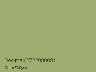 Decimal 272208008 Color is a normal lime color and the nearest color is Green Smoke #a4af6e. Hex code #9ead70 and RGB value is rgb(158,173,112). In RGB color space, this color is composed of 62% red, 68% green, 44% blue, In CMYK color space, this color is composed of 9% cyan, 0% magenta, 35% yellow , 32% black , In HSL color space, this color has a hue angle of 75° , 27% saturation and 56% lightness.