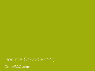 Decimal 272208451 Color is a normal yellow color and the nearest color is Pistachio Green #9dc209. Hex code #9eae0b and RGB value is rgb(158,174,11). In RGB color space, this color is composed of 62% red, 68% green, 4% blue, In CMYK color space, this color is composed of 9% cyan, 0% magenta, 94% yellow , 32% black , In HSL color space, this color has a hue angle of 66° , 88% saturation and 36% lightness.