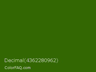 Decimal 4362280962 Color is a very dark green color and the nearest color is Dell #396413. Hex code #336702 and RGB value is rgb(51,103,2). In RGB color space, this color is composed of 20% red, 40% green, 1% blue, In CMYK color space, this color is composed of 50% cyan, 0% magenta, 98% yellow , 60% black , In HSL color space, this color has a hue angle of 91° , 96% saturation and 21% lightness.