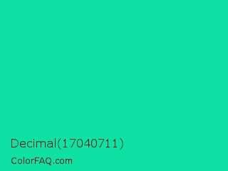Decimal 17040711 Color is a normal green color and the nearest color is Caribbean Green #00cc99. Hex code #0fe0a3 and RGB value is rgb(15,224,163). In RGB color space, this color is composed of 6% red, 88% green, 64% blue, In CMYK color space, this color is composed of 93% cyan, 0% magenta, 27% yellow , 12% black , In HSL color space, this color has a hue angle of 162° , 87% saturation and 47% lightness.