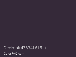 Decimal 4363416151 Color is a very dark purple color and the nearest color is Blackcurrant #32293a. Hex code #352939 and RGB value is rgb(53,41,57). In RGB color space, this color is composed of 21% red, 16% green, 22% blue, In CMYK color space, this color is composed of 7% cyan, 28% magenta, 0% yellow , 78% black , In HSL color space, this color has a hue angle of 285° , 16% saturation and 19% lightness.