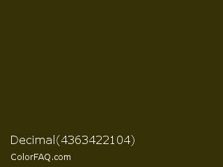 Decimal 4363422104 Color is a very dark yellow color and the nearest color is Madras #3f3002. Hex code #353006 and RGB value is rgb(53,48,6). In RGB color space, this color is composed of 21% red, 19% green, 2% blue, In CMYK color space, this color is composed of 0% cyan, 9% magenta, 89% yellow , 79% black , In HSL color space, this color has a hue angle of 54° , 80% saturation and 12% lightness.