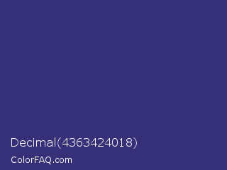 Decimal 4363424018 Color is a normal indigo color and the nearest color is Minsk #3f307f. Hex code #353078 and RGB value is rgb(53,48,120). In RGB color space, this color is composed of 21% red, 19% green, 47% blue, In CMYK color space, this color is composed of 56% cyan, 60% magenta, 0% yellow , 53% black , In HSL color space, this color has a hue angle of 244° , 43% saturation and 33% lightness.