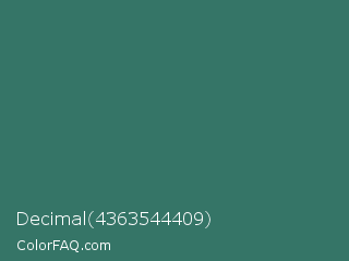 Decimal 4363544409 Color is a normal cyan color and the nearest color is Myrtle Green #317873. Hex code #357567 and RGB value is rgb(53,117,103). In RGB color space, this color is composed of 21% red, 46% green, 40% blue, In CMYK color space, this color is composed of 55% cyan, 0% magenta, 12% yellow , 54% black , In HSL color space, this color has a hue angle of 167° , 38% saturation and 33% lightness.
