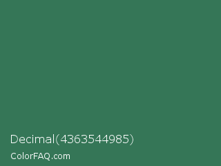 Decimal 4363544985 Color is a normal green color and the nearest color is Amazon #3b7a57. Hex code #357657 and RGB value is rgb(53,118,87). In RGB color space, this color is composed of 21% red, 46% green, 34% blue, In CMYK color space, this color is composed of 55% cyan, 0% magenta, 26% yellow , 54% black , In HSL color space, this color has a hue angle of 151° , 38% saturation and 34% lightness.