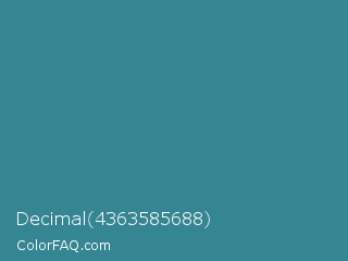 Decimal 4363585688 Color is a normal cyan color and the nearest color is Astral #327da0. Hex code #358592 and RGB value is rgb(53,133,146). In RGB color space, this color is composed of 21% red, 52% green, 57% blue, In CMYK color space, this color is composed of 64% cyan, 9% magenta, 0% yellow , 43% black , In HSL color space, this color has a hue angle of 188° , 47% saturation and 39% lightness.