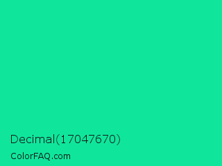 Decimal 17047670 Color is a normal green color and the nearest color is Medium Spring Green #00fa9a. Hex code #0fe69c and RGB value is rgb(15,230,156). In RGB color space, this color is composed of 6% red, 90% green, 61% blue, In CMYK color space, this color is composed of 93% cyan, 0% magenta, 32% yellow , 10% black , In HSL color space, this color has a hue angle of 159° , 88% saturation and 48% lightness.