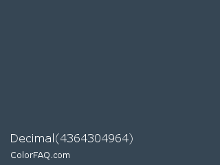 Decimal 4364304964 Color is a dark blue color and the nearest color is Oxford Blue #384555. Hex code #364654 and RGB value is rgb(54,70,84). In RGB color space, this color is composed of 21% red, 27% green, 33% blue, In CMYK color space, this color is composed of 36% cyan, 17% magenta, 0% yellow , 67% black , In HSL color space, this color has a hue angle of 208° , 22% saturation and 27% lightness.