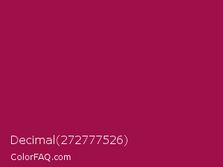 Decimal 272777526 Color is a normal rose color and the nearest color is French Wine #ac1e44. Hex code #9f0f48 and RGB value is rgb(159,15,72). In RGB color space, this color is composed of 62% red, 6% green, 28% blue, In CMYK color space, this color is composed of 0% cyan, 91% magenta, 55% yellow , 38% black , In HSL color space, this color has a hue angle of 336° , 83% saturation and 34% lightness.