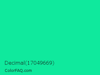 Decimal 17049669 Color is a normal green color and the nearest color is Medium Spring Green #00fa9a. Hex code #0fe99d and RGB value is rgb(15,233,157). In RGB color space, this color is composed of 6% red, 91% green, 62% blue, In CMYK color space, this color is composed of 94% cyan, 0% magenta, 33% yellow , 9% black , In HSL color space, this color has a hue angle of 159° , 88% saturation and 49% lightness.
