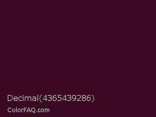 Decimal 4365439286 Color is a very dark rose color and the nearest color is Toledo #3a0020. Hex code #380720 and RGB value is rgb(56,7,32). In RGB color space, this color is composed of 22% red, 3% green, 13% blue, In CMYK color space, this color is composed of 0% cyan, 88% magenta, 43% yellow , 78% black , In HSL color space, this color has a hue angle of 329° , 78% saturation and 12% lightness.
