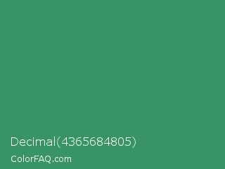 Decimal 4365684805 Color is a normal green color and the nearest color is Sea Green #2e8b57. Hex code #389365 and RGB value is rgb(56,147,101). In RGB color space, this color is composed of 22% red, 58% green, 40% blue, In CMYK color space, this color is composed of 62% cyan, 0% magenta, 31% yellow , 42% black , In HSL color space, this color has a hue angle of 150° , 45% saturation and 40% lightness.