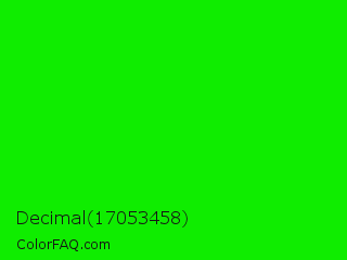 Decimal 17053458 Color is a normal green color and the nearest color is Green #00ff00. Hex code #0fed00 and RGB value is rgb(15,237,0). In RGB color space, this color is composed of 6% red, 93% green, 0% blue, In CMYK color space, this color is composed of 94% cyan, 0% magenta, 100% yellow , 7% black , In HSL color space, this color has a hue angle of 116° , 100% saturation and 46% lightness.