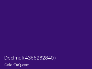Decimal 4366282840 Color is a dark violet color and the nearest color is Windsor #3c0878. Hex code #391072 and RGB value is rgb(57,16,114). In RGB color space, this color is composed of 22% red, 6% green, 45% blue, In CMYK color space, this color is composed of 50% cyan, 86% magenta, 0% yellow , 55% black , In HSL color space, this color has a hue angle of 265° , 75% saturation and 25% lightness.