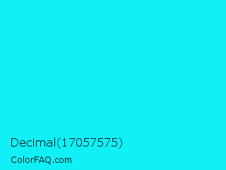 Decimal 17057575 Color is a normal cyan color and the nearest color is Loeen #15f2fd. Hex code #0ff0f7 and RGB value is rgb(15,240,247). In RGB color space, this color is composed of 6% red, 94% green, 97% blue, In CMYK color space, this color is composed of 94% cyan, 3% magenta, 0% yellow , 3% black , In HSL color space, this color has a hue angle of 182° , 94% saturation and 51% lightness.