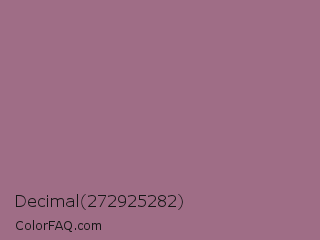 Decimal 272925282 Color is a normal rose color and the nearest color is Strikemaster #956387. Hex code #9f6d86 and RGB value is rgb(159,109,134). In RGB color space, this color is composed of 62% red, 43% green, 53% blue, In CMYK color space, this color is composed of 0% cyan, 31% magenta, 16% yellow , 38% black , In HSL color space, this color has a hue angle of 330° , 21% saturation and 53% lightness.