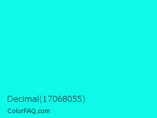 Decimal 17068055 Color is a normal cyan color and the nearest color is Turquoise Blue #00ffef. Hex code #0ff9e9 and RGB value is rgb(15,249,233). In RGB color space, this color is composed of 6% red, 98% green, 91% blue, In CMYK color space, this color is composed of 94% cyan, 0% magenta, 6% yellow , 2% black , In HSL color space, this color has a hue angle of 176° , 95% saturation and 52% lightness.
