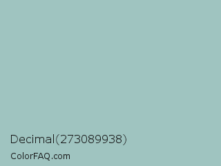Decimal 273089938 Color is a light cyan color and the nearest color is Shadow Green #9ac2b8. Hex code #9fc4c0 and RGB value is rgb(159,196,192). In RGB color space, this color is composed of 62% red, 77% green, 75% blue, In CMYK color space, this color is composed of 19% cyan, 0% magenta, 2% yellow , 23% black , In HSL color space, this color has a hue angle of 174° , 24% saturation and 70% lightness.