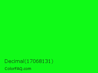 Decimal 17068131 Color is a normal green color and the nearest color is Green #00ff00. Hex code #0ffa17 and RGB value is rgb(15,250,23). In RGB color space, this color is composed of 6% red, 98% green, 9% blue, In CMYK color space, this color is composed of 94% cyan, 0% magenta, 91% yellow , 2% black , In HSL color space, this color has a hue angle of 122° , 96% saturation and 52% lightness.