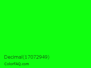 Decimal 17072949 Color is a normal green color and the nearest color is Green #00ff00. Hex code #0fff0f and RGB value is rgb(15,255,15). In RGB color space, this color is composed of 6% red, 100% green, 6% blue, In CMYK color space, this color is composed of 94% cyan, 0% magenta, 94% yellow , 0% black , In HSL color space, this color has a hue angle of 120° , 100% saturation and 53% lightness.