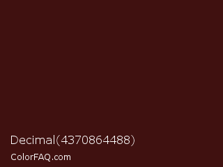 Decimal 4370864488 Color is a very dark red color and the nearest color is Dark Sienna #3c1414. Hex code #401110 and RGB value is rgb(64,17,16). In RGB color space, this color is composed of 25% red, 7% green, 6% blue, In CMYK color space, this color is composed of 0% cyan, 73% magenta, 75% yellow , 75% black , In HSL color space, this color has a hue angle of 1° , 60% saturation and 16% lightness.