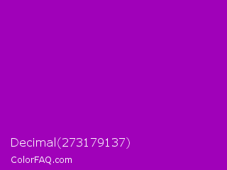 Decimal 273179137 Color is a normal magenta color and the nearest color is Heliotrope Magenta #aa00bb. Hex code #a001b9 and RGB value is rgb(160,1,185). In RGB color space, this color is composed of 63% red, 0% green, 73% blue, In CMYK color space, this color is composed of 14% cyan, 99% magenta, 0% yellow , 27% black , In HSL color space, this color has a hue angle of 292° , 99% saturation and 36% lightness.