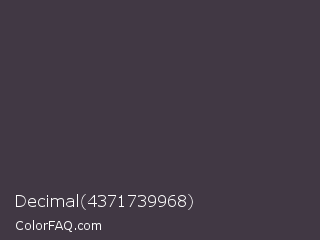 Decimal 4371739968 Color is a dark purple color and the nearest color is Ship Gray #3e3a44. Hex code #413844 and RGB value is rgb(65,56,68). In RGB color space, this color is composed of 25% red, 22% green, 27% blue, In CMYK color space, this color is composed of 4% cyan, 18% magenta, 0% yellow , 73% black , In HSL color space, this color has a hue angle of 285° , 10% saturation and 24% lightness.