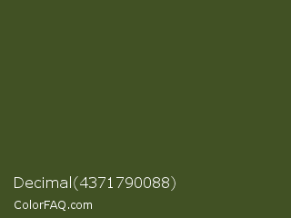 Decimal 4371790088 Color is a dark green color and the nearest color is Army Green #4b5320. Hex code #415124 and RGB value is rgb(65,81,36). In RGB color space, this color is composed of 25% red, 32% green, 14% blue, In CMYK color space, this color is composed of 20% cyan, 0% magenta, 56% yellow , 68% black , In HSL color space, this color has a hue angle of 81° , 38% saturation and 23% lightness.