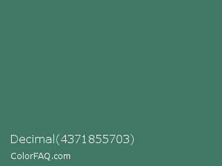 Decimal 4371855703 Color is a normal green color and the nearest color is Hookers Green #49796b. Hex code #417865 and RGB value is rgb(65,120,101). In RGB color space, this color is composed of 25% red, 47% green, 40% blue, In CMYK color space, this color is composed of 46% cyan, 0% magenta, 16% yellow , 53% black , In HSL color space, this color has a hue angle of 159° , 30% saturation and 36% lightness.