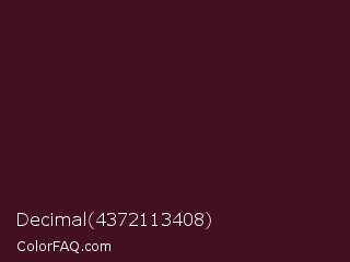 Decimal 4372113408 Color is a very dark rose color and the nearest color is Cocoa Bean #481c1c. Hex code #421020 and RGB value is rgb(66,16,32). In RGB color space, this color is composed of 26% red, 6% green, 13% blue, In CMYK color space, this color is composed of 0% cyan, 76% magenta, 52% yellow , 74% black , In HSL color space, this color has a hue angle of 341° , 61% saturation and 16% lightness.