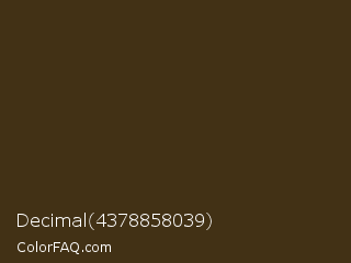 Decimal 4378858039 Color is a very dark orange color and the nearest color is Black Marlin #3e2c1c. Hex code #423115 and RGB value is rgb(66,49,21). In RGB color space, this color is composed of 26% red, 19% green, 8% blue, In CMYK color space, this color is composed of 0% cyan, 26% magenta, 68% yellow , 74% black , In HSL color space, this color has a hue angle of 37° , 52% saturation and 17% lightness.