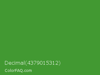 Decimal 4379015312 Color is a normal green color and the nearest color is May Green #4c9141. Hex code #429932 and RGB value is rgb(66,153,50). In RGB color space, this color is composed of 26% red, 60% green, 20% blue, In CMYK color space, this color is composed of 57% cyan, 0% magenta, 67% yellow , 40% black , In HSL color space, this color has a hue angle of 111° , 51% saturation and 40% lightness.