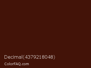 Decimal 4379218048 Color is a very dark red color and the nearest color is Rebel #3c1206. Hex code #431308 and RGB value is rgb(67,19,8). In RGB color space, this color is composed of 26% red, 7% green, 3% blue, In CMYK color space, this color is composed of 0% cyan, 72% magenta, 88% yellow , 74% black , In HSL color space, this color has a hue angle of 11° , 79% saturation and 15% lightness.
