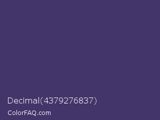 Decimal 4379276837 Color is a normal indigo color and the nearest color is Jacarta #3a2a6a. Hex code #433469 and RGB value is rgb(67,52,105). In RGB color space, this color is composed of 26% red, 20% green, 41% blue, In CMYK color space, this color is composed of 36% cyan, 50% magenta, 0% yellow , 59% black , In HSL color space, this color has a hue angle of 257° , 34% saturation and 31% lightness.