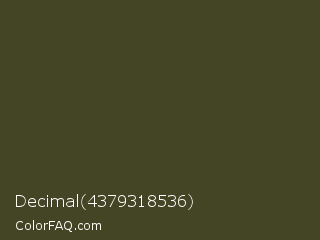 Decimal 4379318536 Color is a very dark yellow color and the nearest color is Lisbon Brown #423921. Hex code #434524 and RGB value is rgb(67,69,36). In RGB color space, this color is composed of 26% red, 27% green, 14% blue, In CMYK color space, this color is composed of 3% cyan, 0% magenta, 48% yellow , 73% black , In HSL color space, this color has a hue angle of 64° , 31% saturation and 21% lightness.