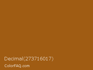 Decimal 273716017 Color is a normal orange color and the nearest color is Hawaiian Tan #9d5616. Hex code #a05c13 and RGB value is rgb(160,92,19). In RGB color space, this color is composed of 63% red, 36% green, 7% blue, In CMYK color space, this color is composed of 0% cyan, 43% magenta, 88% yellow , 37% black , In HSL color space, this color has a hue angle of 31° , 79% saturation and 35% lightness.