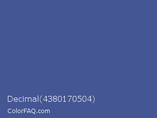 Decimal 4380170504 Color is a normal blue color and the nearest color is Chambray #354e8c. Hex code #445694 and RGB value is rgb(68,86,148). In RGB color space, this color is composed of 27% red, 34% green, 58% blue, In CMYK color space, this color is composed of 54% cyan, 42% magenta, 0% yellow , 42% black , In HSL color space, this color has a hue angle of 227° , 37% saturation and 42% lightness.