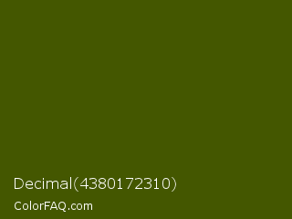 Decimal 4380172310 Color is a very dark lime color and the nearest color is Verdun Green #495400. Hex code #445700 and RGB value is rgb(68,87,0). In RGB color space, this color is composed of 27% red, 34% green, 0% blue, In CMYK color space, this color is composed of 22% cyan, 0% magenta, 100% yellow , 66% black , In HSL color space, this color has a hue angle of 73° , 100% saturation and 17% lightness.