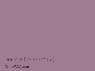 Decimal 273774162 Color is a normal magenta color and the nearest color is Mountbatten Pink #997a8d. Hex code #a07c94 and RGB value is rgb(160,124,148). In RGB color space, this color is composed of 63% red, 49% green, 58% blue, In CMYK color space, this color is composed of 0% cyan, 23% magenta, 8% yellow , 37% black , In HSL color space, this color has a hue angle of 320° , 16% saturation and 56% lightness.
