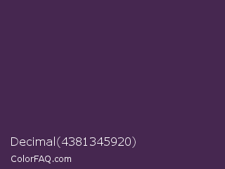 Decimal 4381345920 Color is a dark purple color and the nearest color is Bossanova #4e2a5a. Hex code #462750 and RGB value is rgb(70,39,80). In RGB color space, this color is composed of 27% red, 15% green, 31% blue, In CMYK color space, this color is composed of 13% cyan, 51% magenta, 0% yellow , 69% black , In HSL color space, this color has a hue angle of 285° , 34% saturation and 23% lightness.