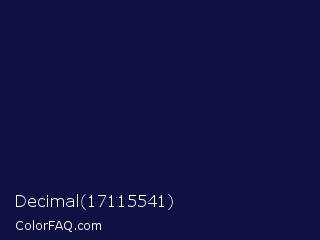 Decimal 17115541 Color is a very dark blue color and the nearest color is Deep Cove #051040. Hex code #101143 and RGB value is rgb(16,17,67). In RGB color space, this color is composed of 6% red, 7% green, 26% blue, In CMYK color space, this color is composed of 76% cyan, 75% magenta, 0% yellow , 74% black , In HSL color space, this color has a hue angle of 239° , 61% saturation and 16% lightness.