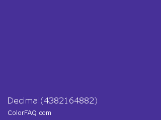 Decimal 4382164882 Color is a normal indigo color and the nearest color is Daisy Bush #4f2398. Hex code #473098 and RGB value is rgb(71,48,152). In RGB color space, this color is composed of 28% red, 19% green, 60% blue, In CMYK color space, this color is composed of 53% cyan, 68% magenta, 0% yellow , 40% black , In HSL color space, this color has a hue angle of 253° , 52% saturation and 39% lightness.