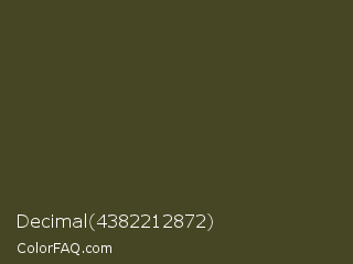 Decimal 4382212872 Color is a very dark yellow color and the nearest color is Army Green #4b5320. Hex code #474624 and RGB value is rgb(71,70,36). In RGB color space, this color is composed of 28% red, 27% green, 14% blue, In CMYK color space, this color is composed of 0% cyan, 1% magenta, 49% yellow , 72% black , In HSL color space, this color has a hue angle of 58° , 33% saturation and 21% lightness.
