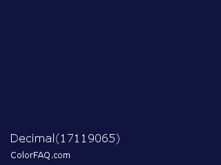Decimal 17119065 Color is a very dark blue color and the nearest color is Deep Cove #051040. Hex code #10143f and RGB value is rgb(16,20,63). In RGB color space, this color is composed of 6% red, 8% green, 25% blue, In CMYK color space, this color is composed of 75% cyan, 68% magenta, 0% yellow , 75% black , In HSL color space, this color has a hue angle of 235° , 59% saturation and 15% lightness.