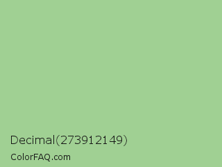 Decimal 273912149 Color is a light green color and the nearest color is Feijoa #9fdd8c. Hex code #a0d093 and RGB value is rgb(160,208,147). In RGB color space, this color is composed of 63% red, 82% green, 58% blue, In CMYK color space, this color is composed of 23% cyan, 0% magenta, 29% yellow , 18% black , In HSL color space, this color has a hue angle of 107° , 39% saturation and 70% lightness.