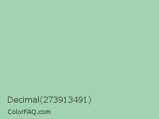 Decimal 273913491 Color is a light green color and the nearest color is Turquoise Green #a0d6b4. Hex code #a0d2ad and RGB value is rgb(160,210,173). In RGB color space, this color is composed of 63% red, 82% green, 68% blue, In CMYK color space, this color is composed of 24% cyan, 0% magenta, 18% yellow , 18% black , In HSL color space, this color has a hue angle of 136° , 36% saturation and 73% lightness.