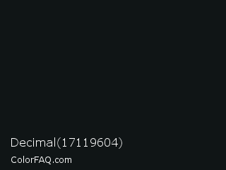 Decimal 17119604 Color is a almost black cyan color and the nearest color is Bunker #0d1117. Hex code #101516 and RGB value is rgb(16,21,22). In RGB color space, this color is composed of 6% red, 8% green, 9% blue, In CMYK color space, this color is composed of 27% cyan, 5% magenta, 0% yellow , 91% black , In HSL color space, this color has a hue angle of 190° , 16% saturation and 7% lightness.