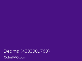 Decimal 4383381768 Color is a dark violet color and the nearest color is Pixie Powder #391285. Hex code #491184 and RGB value is rgb(73,17,132). In RGB color space, this color is composed of 29% red, 7% green, 52% blue, In CMYK color space, this color is composed of 45% cyan, 87% magenta, 0% yellow , 48% black , In HSL color space, this color has a hue angle of 269° , 77% saturation and 29% lightness.