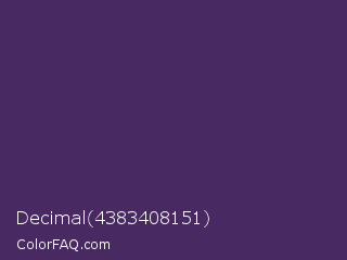 Decimal 4383408151 Color is a dark purple color and the nearest color is Bossanova #4e2a5a. Hex code #492961 and RGB value is rgb(73,41,97). In RGB color space, this color is composed of 29% red, 16% green, 38% blue, In CMYK color space, this color is composed of 25% cyan, 58% magenta, 0% yellow , 62% black , In HSL color space, this color has a hue angle of 274° , 41% saturation and 27% lightness.